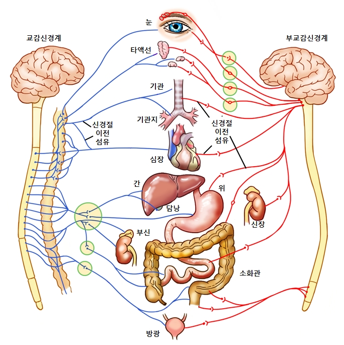 교감신경은 위급한 상황에 빠졌을 경우 빠르게 대처할 수 있도록 도와줍니다. 교감신경 자극 시 골격과 신경으로가는 혈액양이 늘어나며 심장박동은 빨라지고 감각도 예민해집니다.