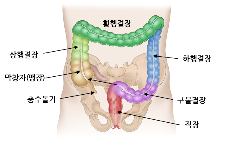 오른쪽 아랫배, 우장골과 골반원 안에 위치합니다.