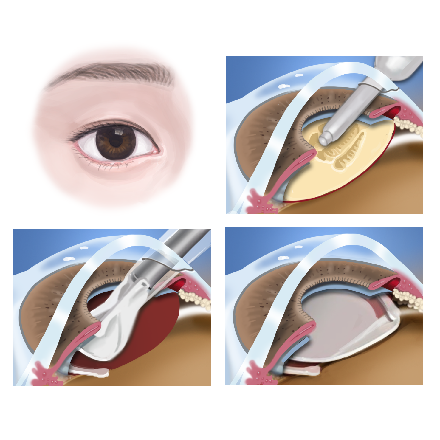 백내장 수술은 눈의 검은자나 흰자에 작은 구멍을 만든 후, 이곳에 초음파 기구를 삽입하여 백내장이 생긴 수정체를 흡인하고 그 자리에 수정체와 유사하게 생긴 영구적인 인공 수정체를 삽입하는 방식으로 시행됩니다. 안경알의 두께가 다양하여 여러 도수가 있는 것처럼, 수술을 받는 사람의 필요에 맞추어 가까운 곳 또는 먼 곳이 잘 보이도록 인공 수정체의 도수를 선택하여 눈 안에 삽입합니다.
