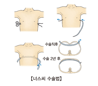 최근에는 리모델링 성형술식을 선호합니다. 무엇보다도 가장 큰 장점은 수술의 규모가 라비치 방법처럼 크지 않다는 것입니다. 절개 부위가 작을 뿐만 아니라, 수술 시간도 1시간 전후로 짧고, 출혈이 거의 없으며, 수술 후 통증도 상대적으로 적어 회복 기간이 짧습니다. 수술 방법은 매우 간단합니다. 양측에 약 2~3cm 정도로 피부를 절개하고, 환자에게 맞는 굵은 철심을 흉골 밑으로 삽입하여 환자의 흉벽을 들어 올리는 것입니다. 그러나 아직 장기 성적이 나와 있지 않습니다. 또한 아이들의 성장에 맞추어서 2~3년 후에 몸 안에 고정되어 있던 철심을 뽑아야 하는 문제가 있습니다.